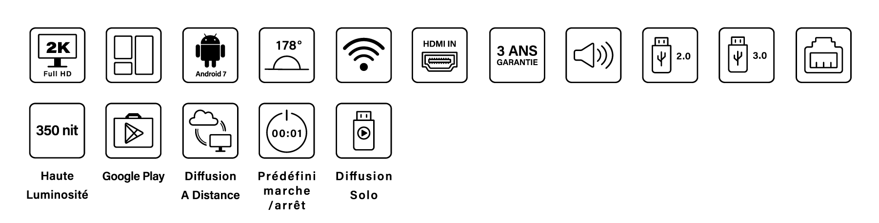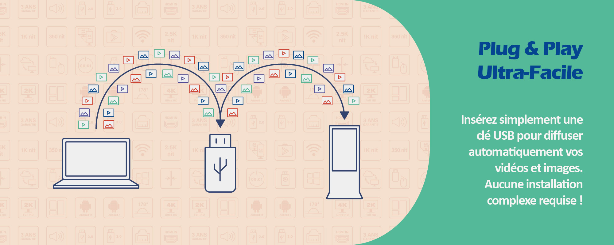 Mode de diffusion de contenu: En local, via clé USB; A distance, depuis un serveur sur site ou un serveur hébergé (Cloud)