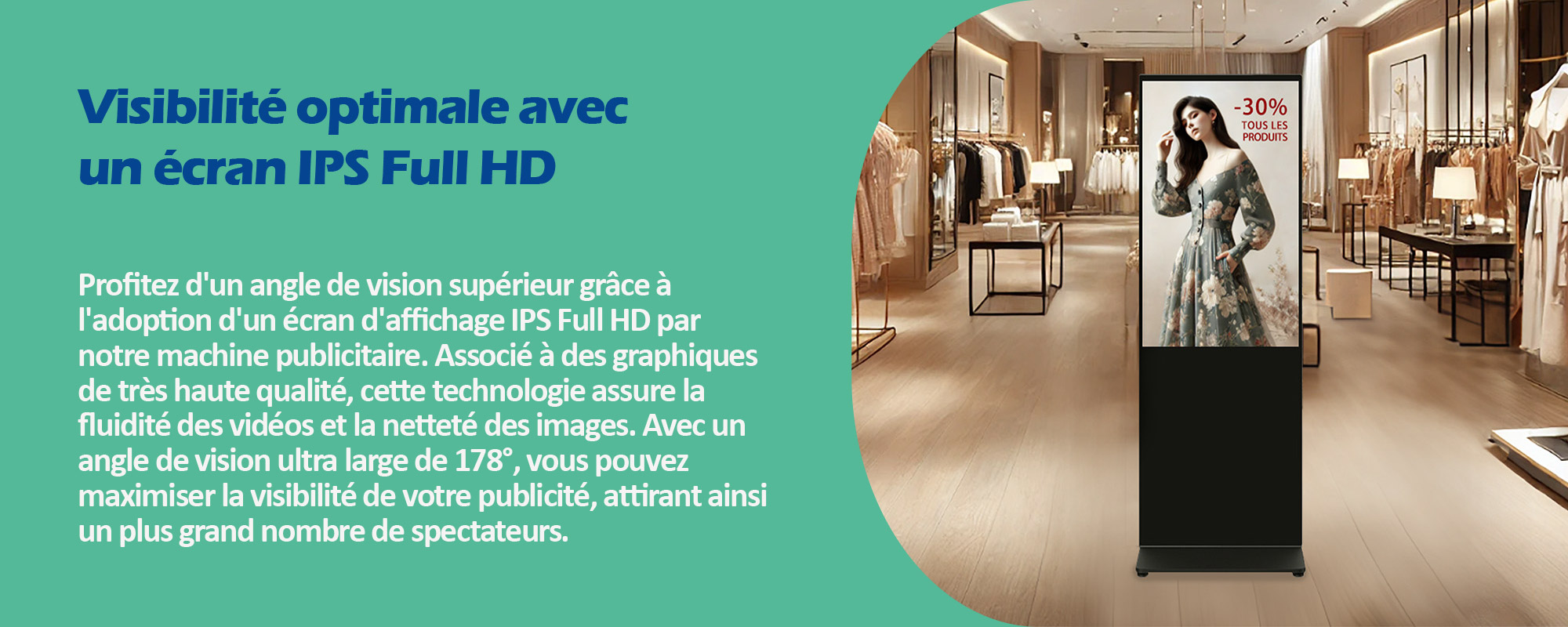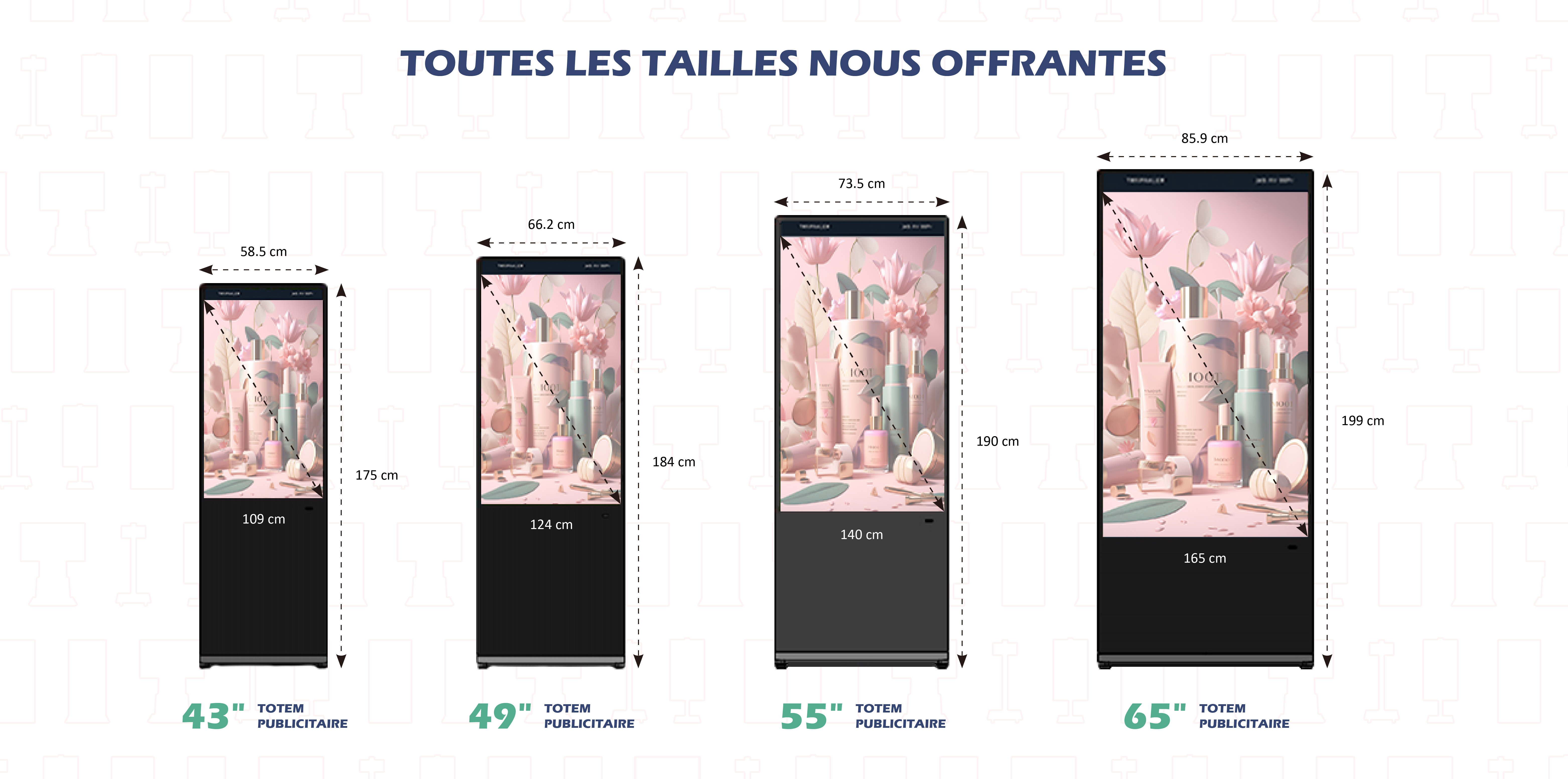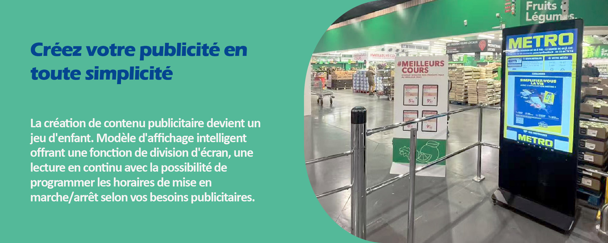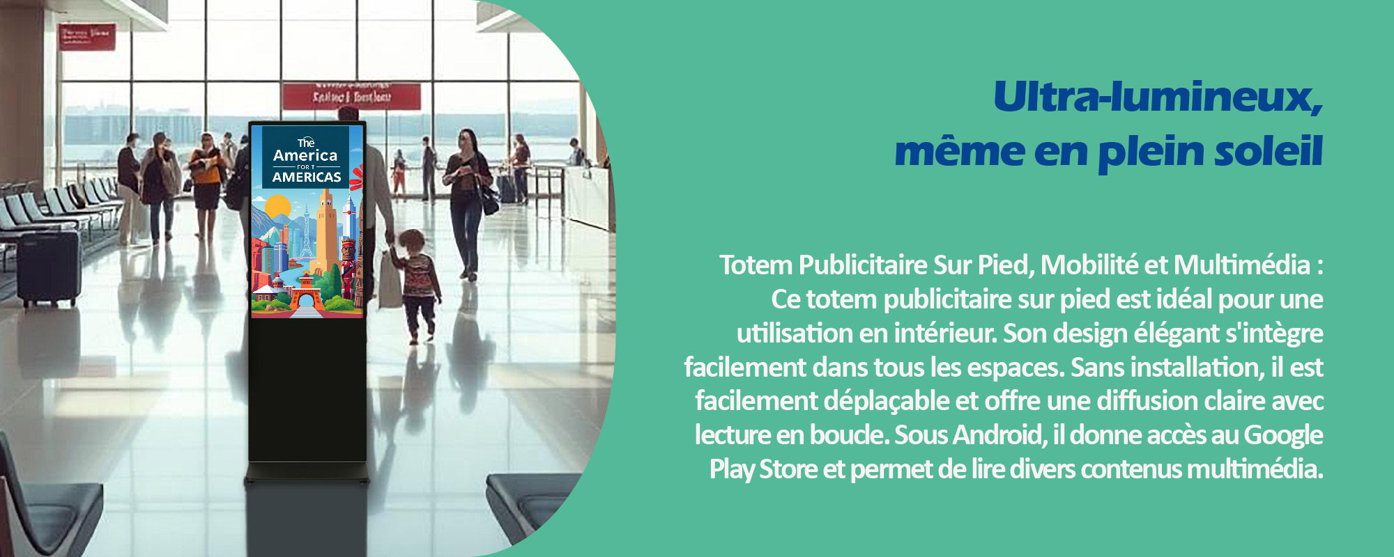 Les totems publicitaires sont des éléments incontournables pour attirer l'attention de votre public et mettre en avant votre marque ou vos produits dans les espaces commerciaux, les salons professionnels, les halls d'entrée, et bien plus encore. Avec leur design élégant et leur visibilité imposante, nos totems publicitaires offrent une plateforme idéale pour diffuser vos messages de manière percutante et mémorable. Dotés de technologies avancées, nos totems vous permettent de communiquer efficacement avec votre audience, que ce soit pour présenter des offres spéciales, des vidéos promotionnelles, des informations produits, ou des messages publicitaires. Transformez votre espace en un véritable point focal avec nos totems publicitaires personnalisables.