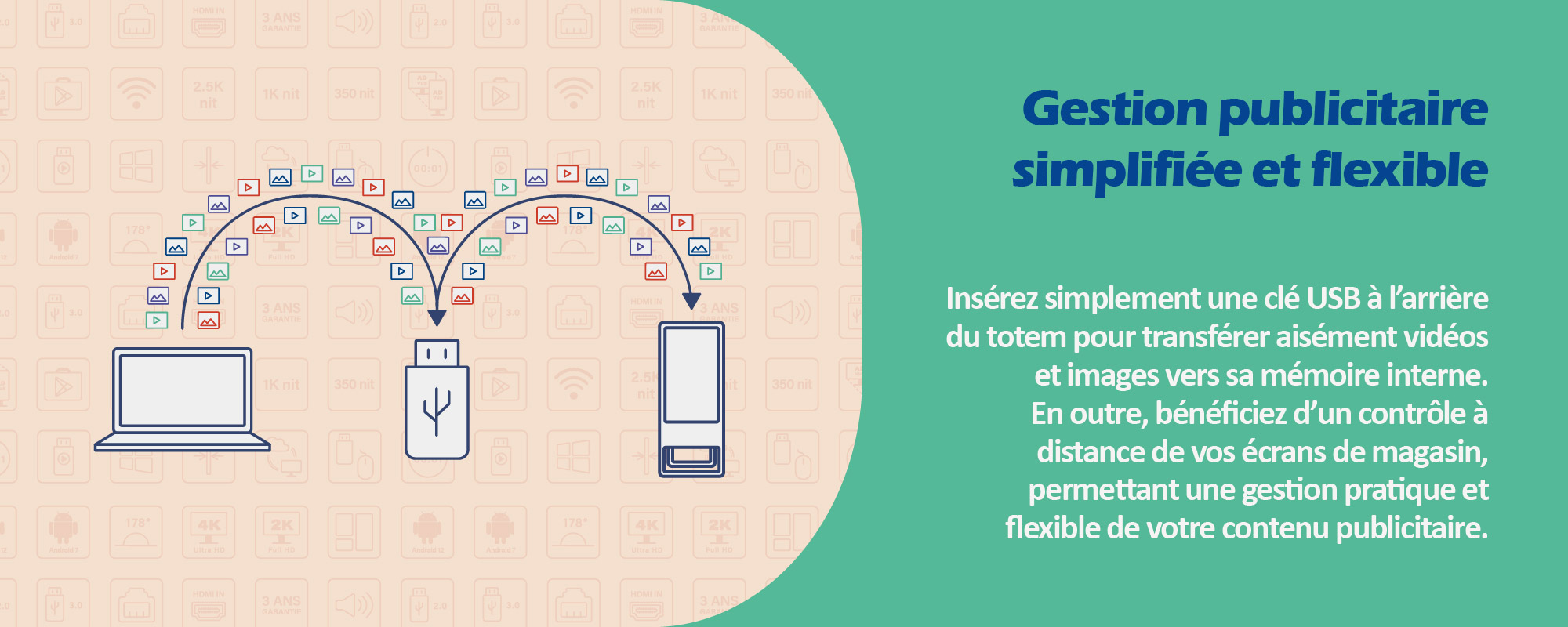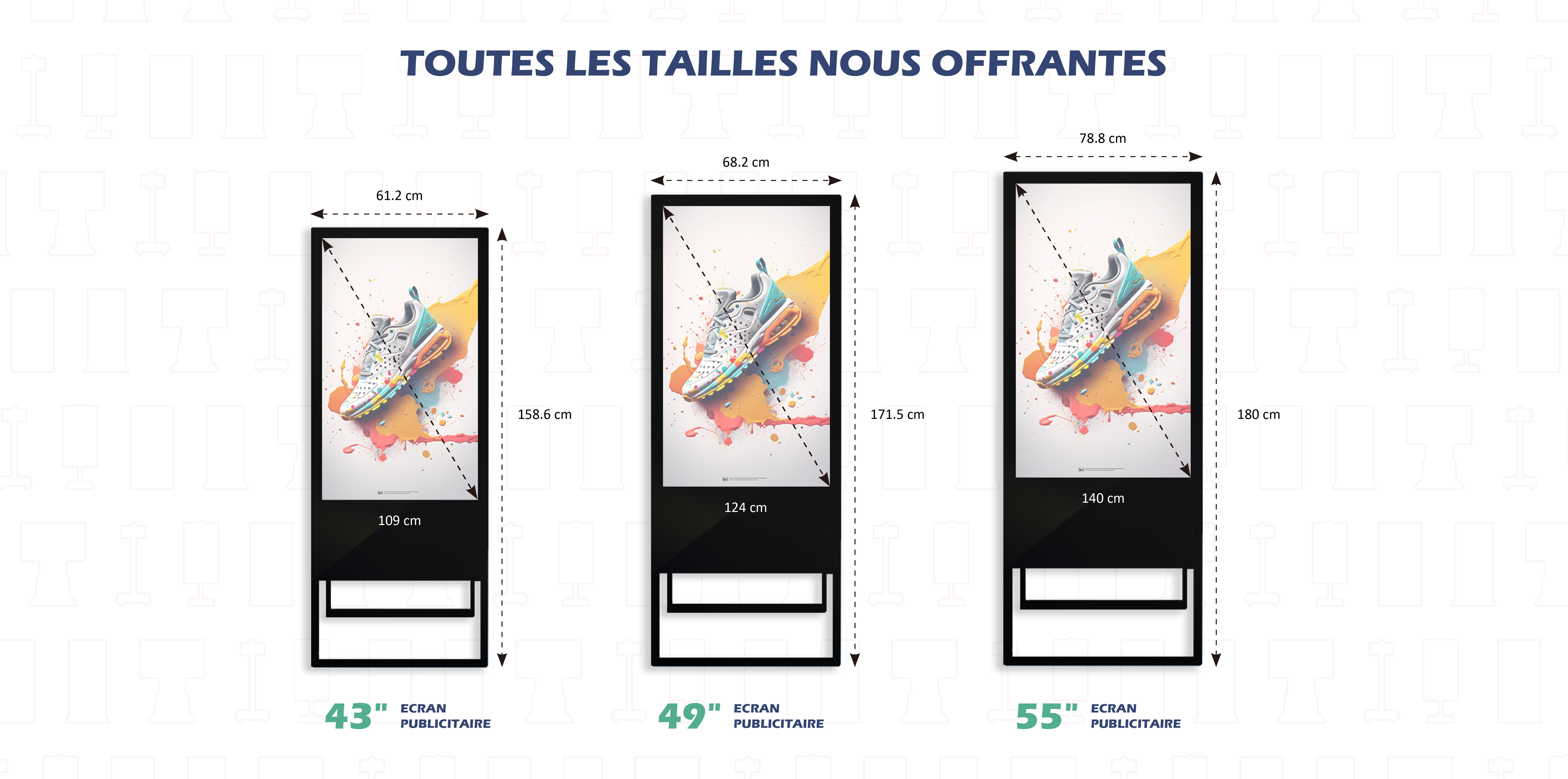 Les totems publicitaires sont des éléments incontournables pour attirer l'attention de votre public et mettre en avant votre marque ou vos produits dans les espaces commerciaux, les salons professionnels, les halls d'entrée, et bien plus encore. Avec leur design élégant et leur visibilité imposante, nos totems publicitaires offrent une plateforme idéale pour diffuser vos messages de manière percutante et mémorable. Dotés de technologies avancées, nos totems vous permettent de communiquer efficacement avec votre audience, que ce soit pour présenter des offres spéciales, des vidéos promotionnelles, des informations produits, ou des messages publicitaires. Transformez votre espace en un véritable point focal avec nos totems publicitaires personnalisables.