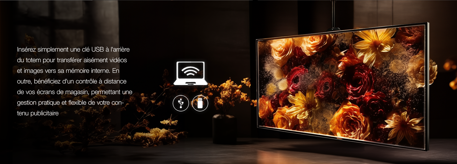 Mode de diffusion de contenu: En local, via clé USB; A distance, depuis un serveur sur site ou un serveur hébergé (Cloud)